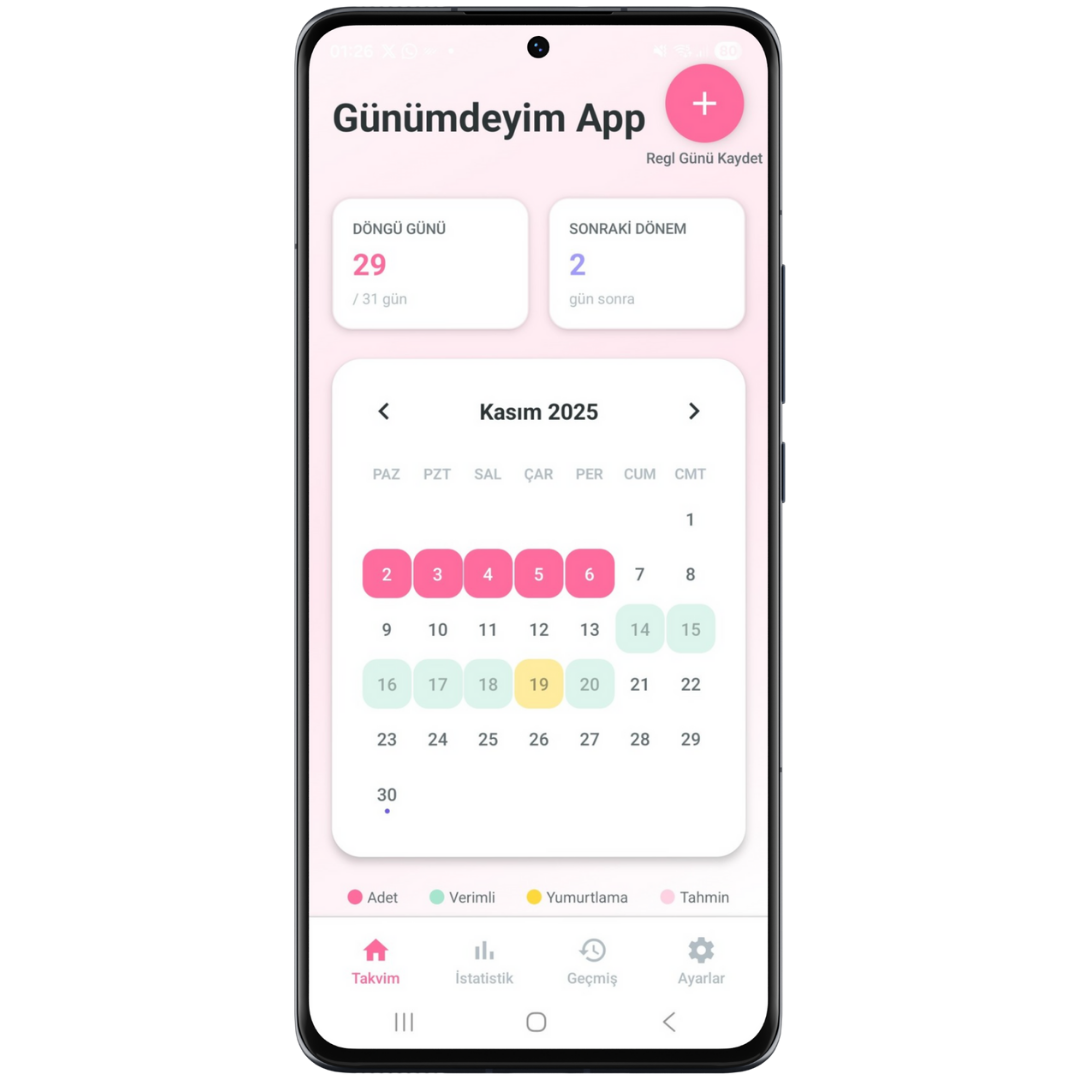 Basit kullanımı ve arayüzü ile Günümdeyim App regl döneminiz için benzersiz yaratılmıştır.