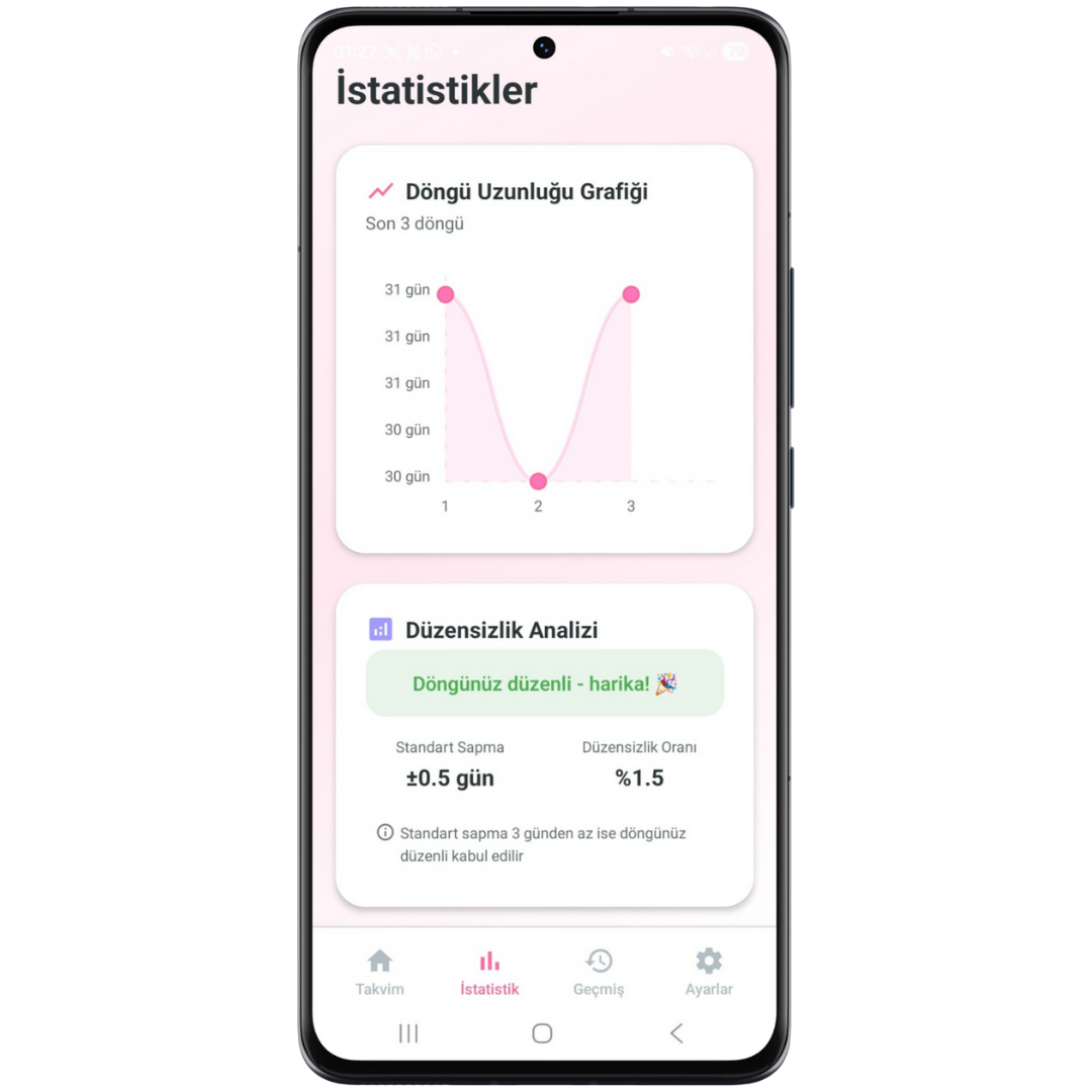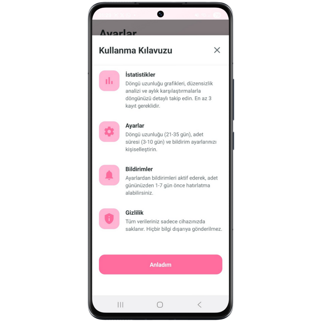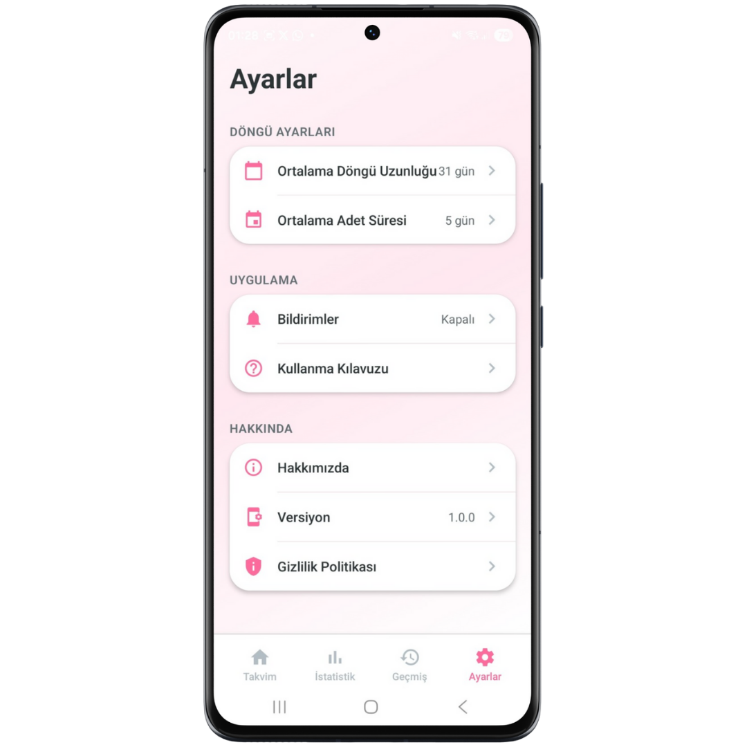 Döngü uzunluğunuzu ve ortalama adet sürenizi manuel olarak da girebilirsiniz. Bildirimlerden regl öncesi hatırlatma alabilirsiniz.