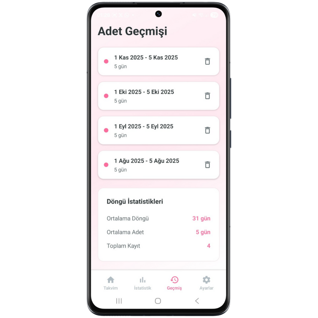 Basit, sezgisel arayüzle dönem tarihlerinizi hızlıca kaydedin. Her gün sadece birkaç tıklamayla tüm verilerinizi güncel tutun.